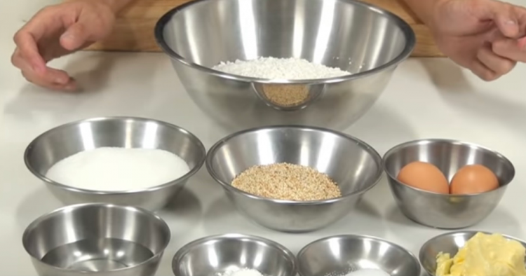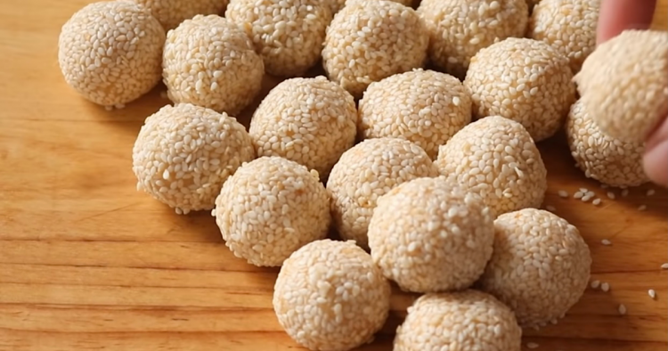 วัตถุดิบ แป้งสาลีอเนกประสงค์ 300 กรัม แป้งข้าวโพด 25 กรัม ไข่ไก่ 2 ฟอง เนยสดละลาย 35 กรัม ผงฟู 1 ช้อนชา เบกกิ้งโซดา 1/2 ช้อนชา น้ำตาลทราย 125 กรัม เกลือป่น 1/2 ช้อนชา กลิ่นวนิลา 1/2 ช้อนชา งาขาวคั่ว น้ำมันสำหรับทอด